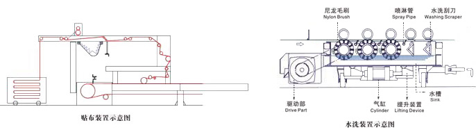 导带清洗直接关系到印花质量,本机水洗装置由3根尼龙毛刷,3根喷淋管及2根刮刀等组成,整个装置为气动结构,使导带能达到最好的清洗效果。